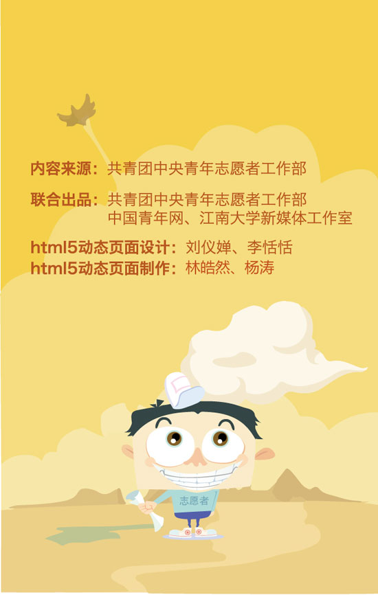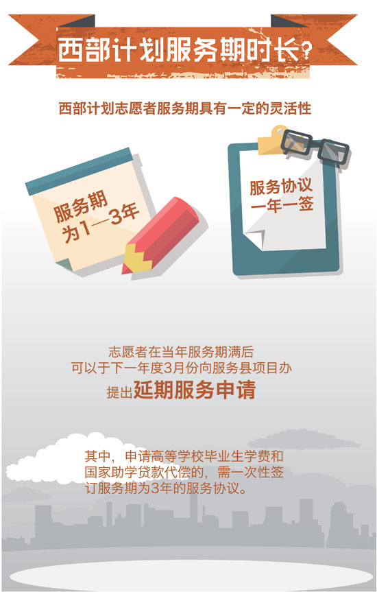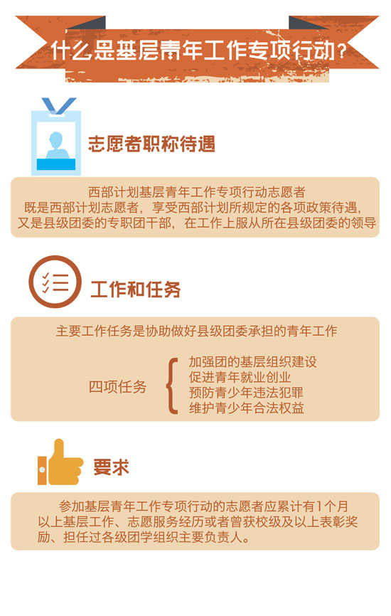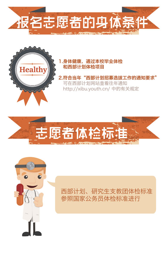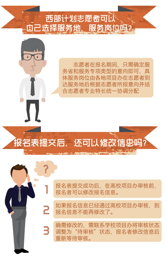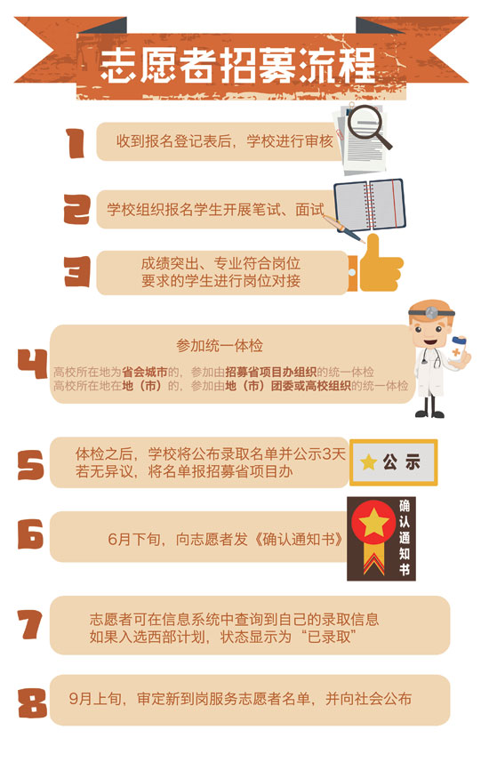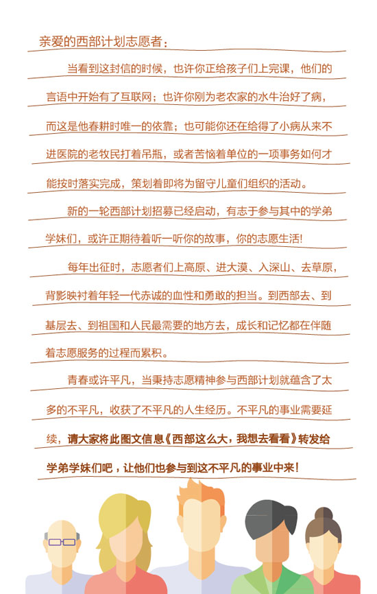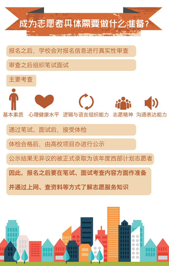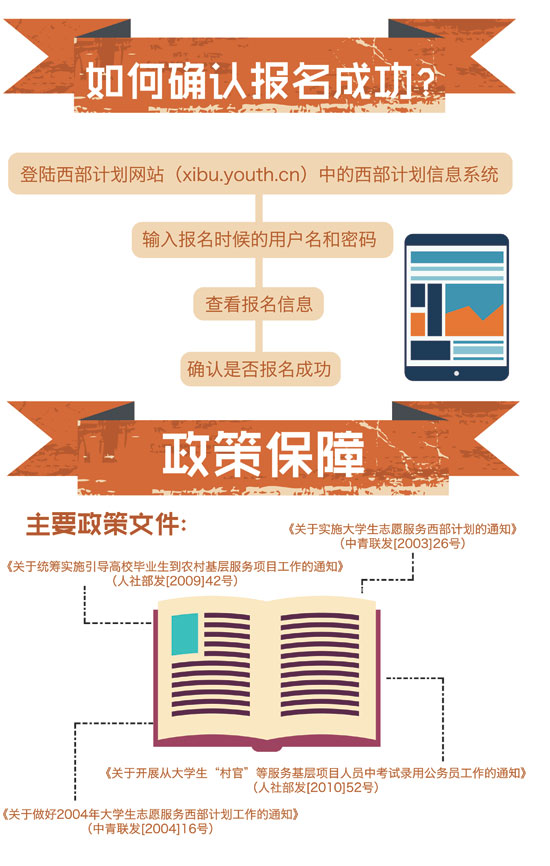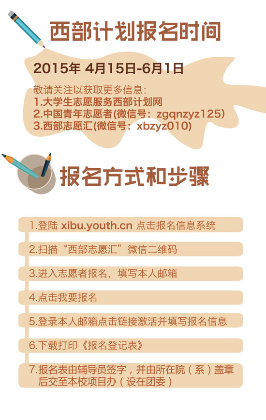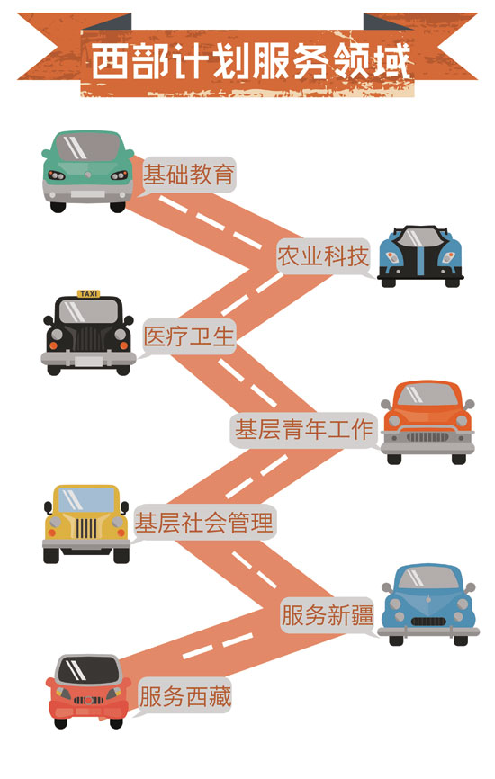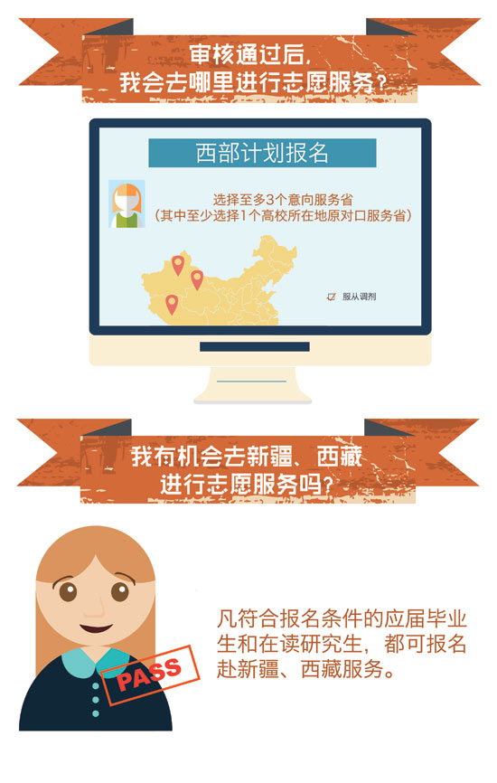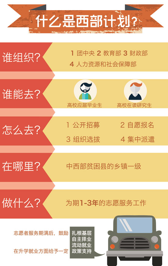近日,2015年大学生志愿服务西部计划网上报名正在火热进行中,由团中央志愿者工作部、中国青年网和江南大学新媒体工作室联合制作出品了西部计划图表。图表简明扼要,图文并茂,通俗易懂地介绍了西部计划从报名到具体实施的方方面面,以此帮助关注并想报名参加西部计划的广大高校毕业生对西部计划的了解。真可谓,西部这么大,一图在手,想去哪就去哪,说走就走。