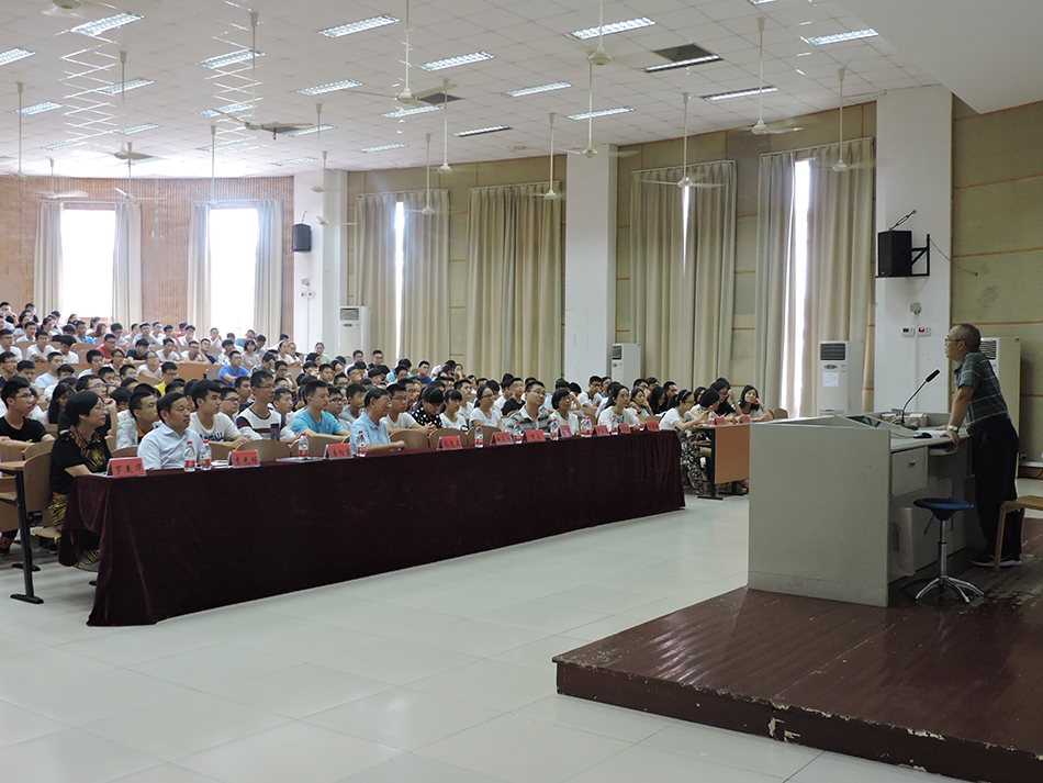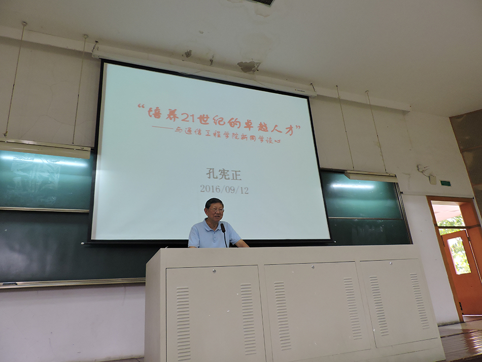 孔宪正教授则总结了他的人生阅历,结合自己的切身经历,给大一新生在学习和生活等诸多方面给予很多很好的意见和建议。他声情并茂地与同学们分享了成才需要具备的四种能力,即“BQ(健康)+IQ(智商)+EQ(情商)+SQ(灵商)”,他提出:“运动是健康的源泉”、“创新与实践相结合”、“成功更来自于情商和灵商而非智商”等观点,在场同学都听得津津有味,并不时发出阵阵掌声。