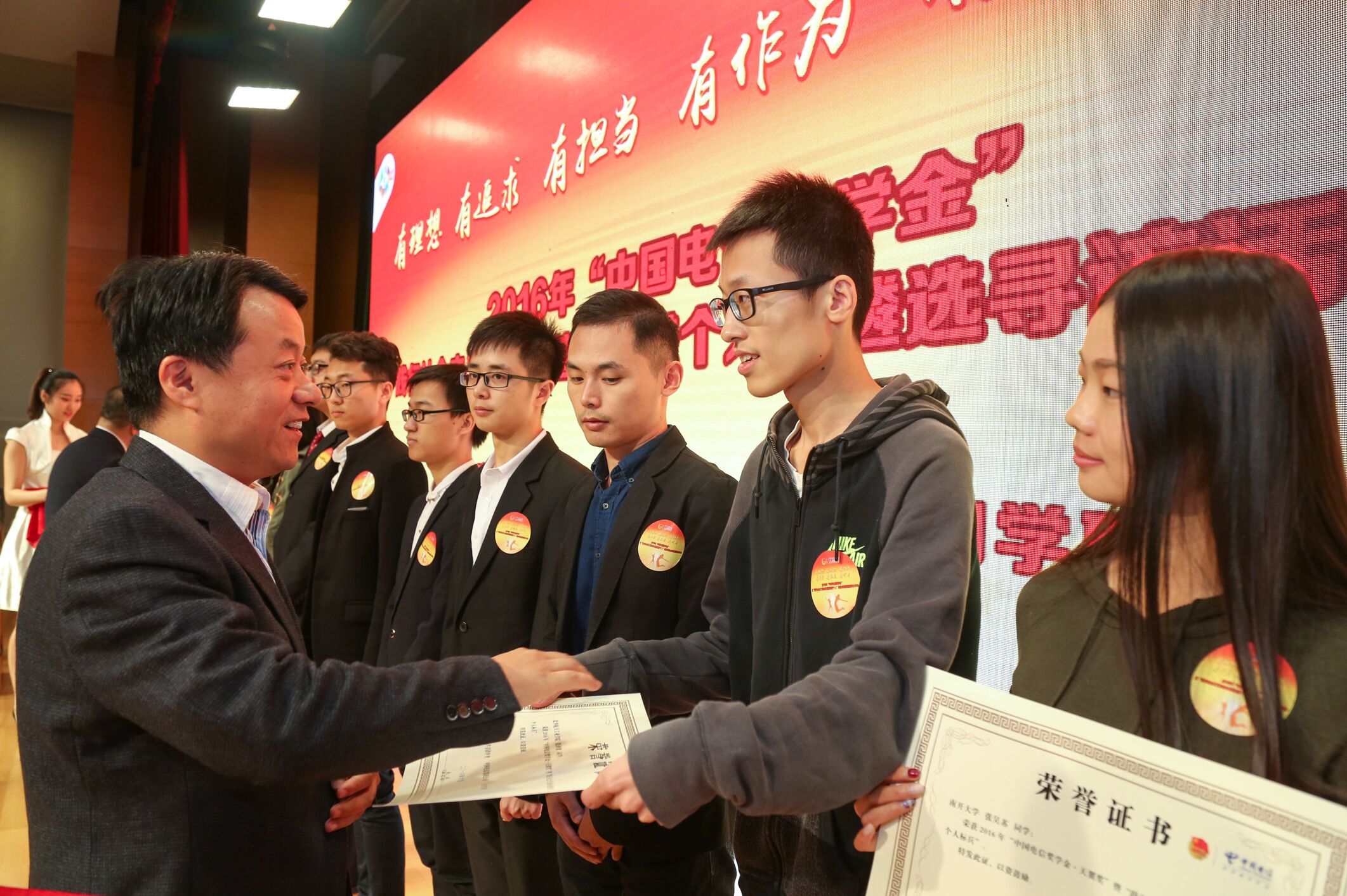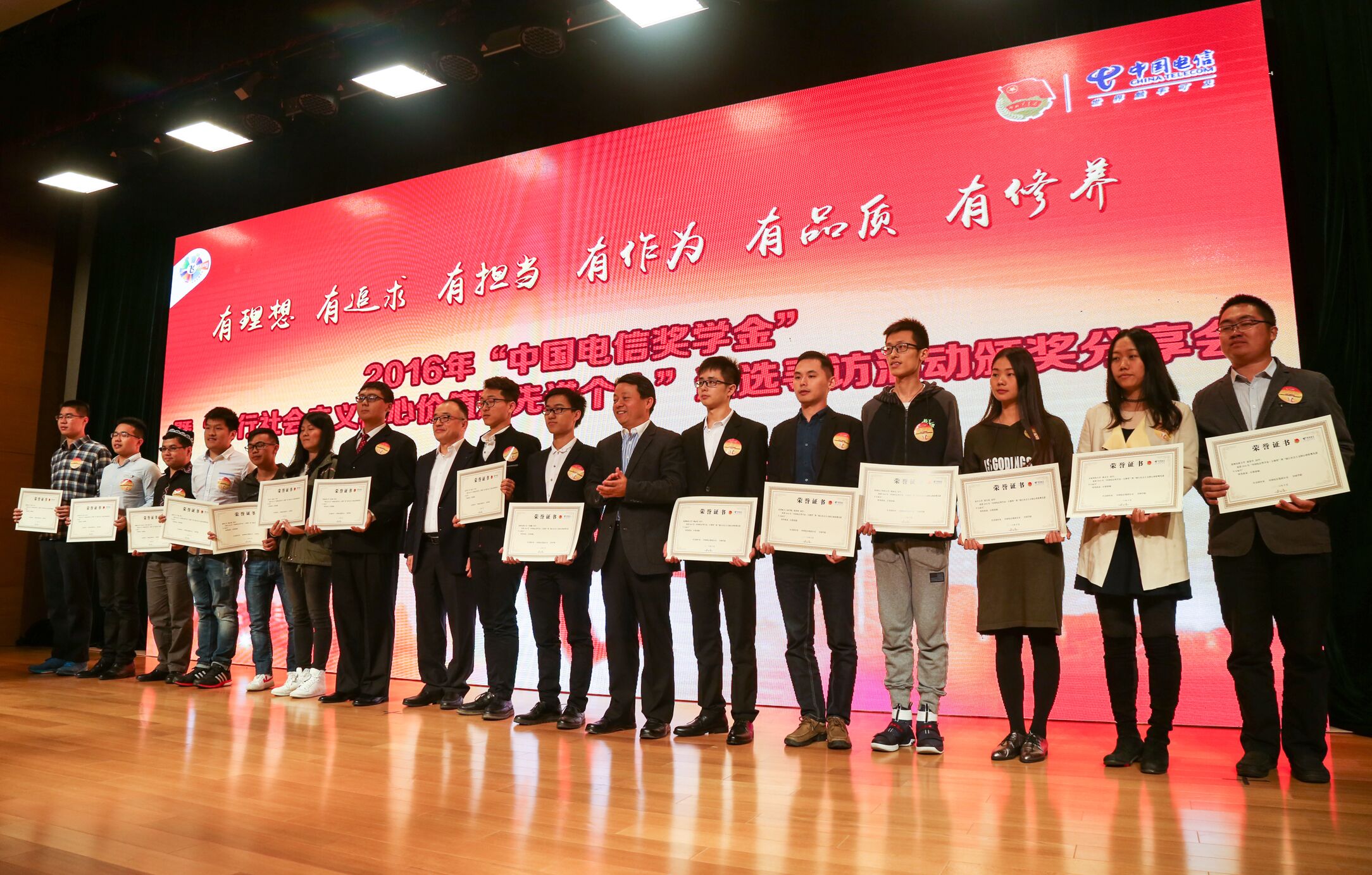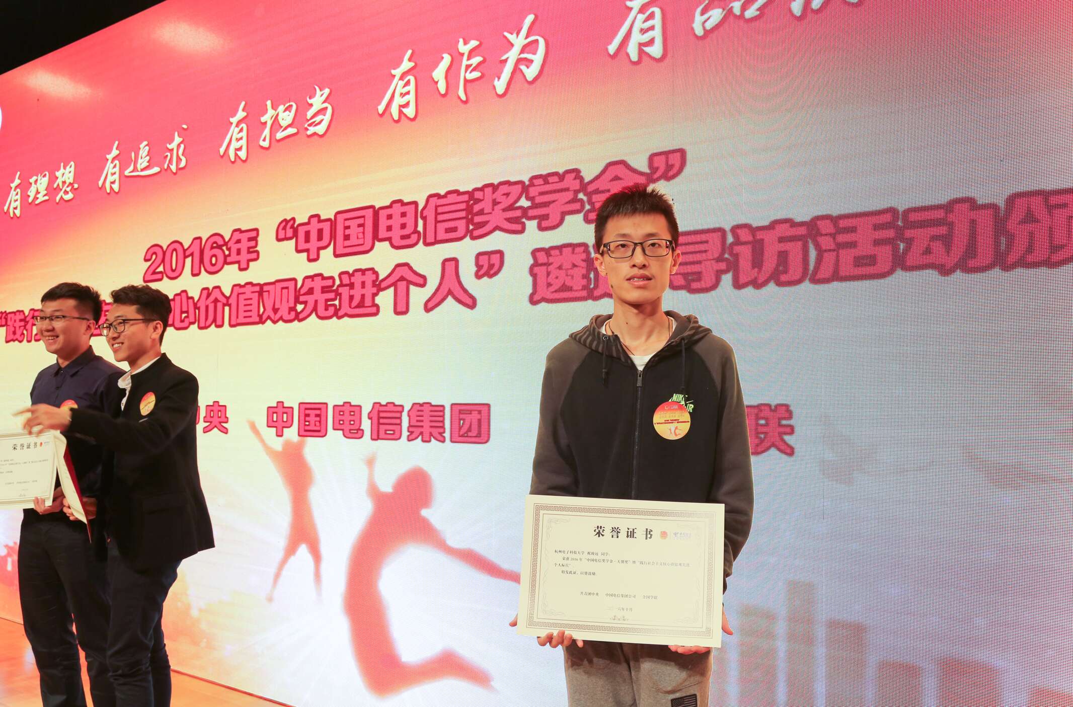 10月9日上午,杭州电子科技大学通信工程学院通信工程专业大四学生祝致远在北京中国人民大学受到了团中央的表彰。他以在大学期间的优异表现荣膺2016年度“中国电信奖学金.天翼奖”暨“践行社会主义核心价值观先进个人标兵”,全国共有50位在校大学生获此殊荣,祝致远也是本年度这一奖项浙江省唯一一位获得者,同时也是自该奖项设置以来我校历史上第一位获得该奖的在校大学生。图为祝致远同学在接受表彰。