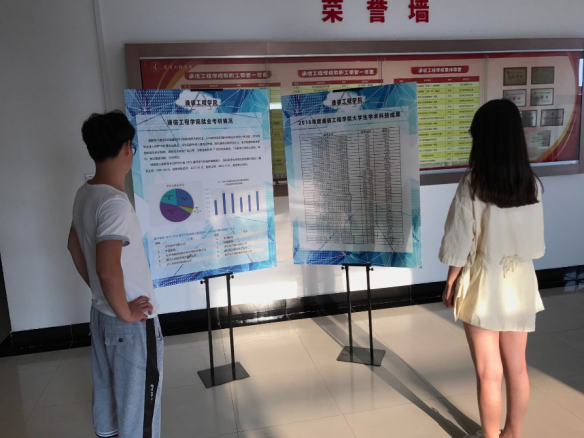 第一教研楼信仁楼内,排列着通信学院研究生奖学金、学术新秀、学科竞赛获奖情况等一系列展板,吸引了很多新生驻足观看。