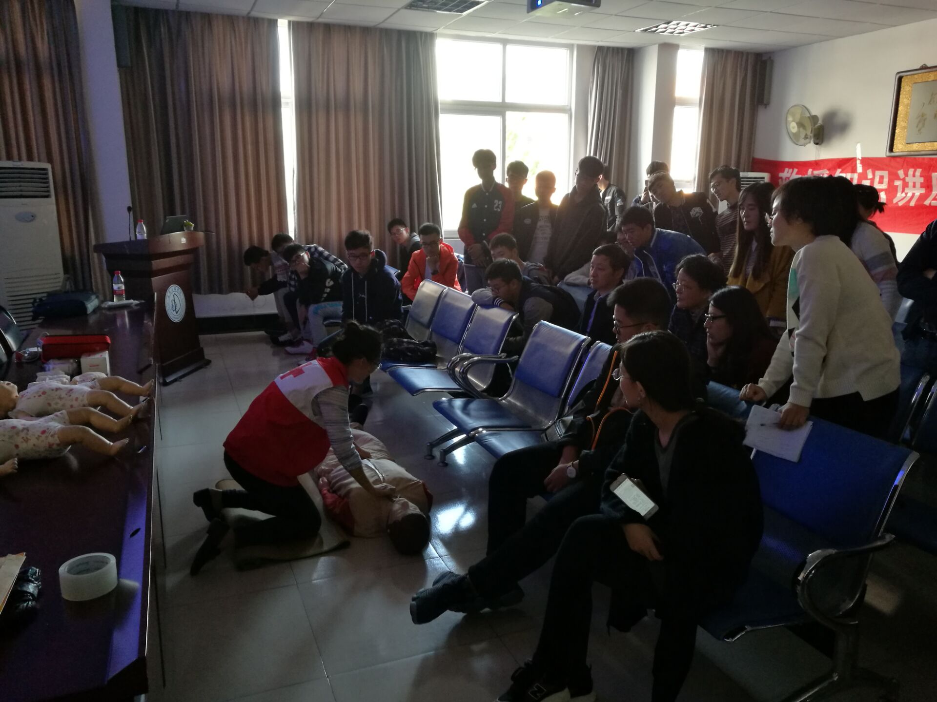 在两个多小时的时间里,罗原详细讲授了红十字运动知识、常见急症和意外伤害的急救知识,演示了止血、包扎等创伤救护技能、AED的使用和现场心肺复苏操作技能。随着培训内容的展开,现场气氛不断活跃,师生们不仅积极回应提问,还踊跃到台前扮演伤员配合老师授课。培训结束时,大家意犹未尽,有的在培训老师的指导下利用模拟人练习心肺复苏,有的进一步向培训老师了解日常生活中常见伤害的详细急救处理。