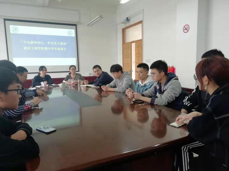 2019年11月5日下午,为深入贯彻OBE教学理念,树立以学生为中心的核心观念,牢牢抓住本科教学初心,通信工程学院在第一教学楼北314召开了“不忘教学初心、牢记育人使命”期中学生座谈会。会议由学院副书记何雅丽和教学副院长应娜主持,学工办和教科办相关老师以及来自不同年级具有代表性的8名学生参加了本次会议。这次会议也是学院教学质量监控体系中“校内循环”的重要环节之一。