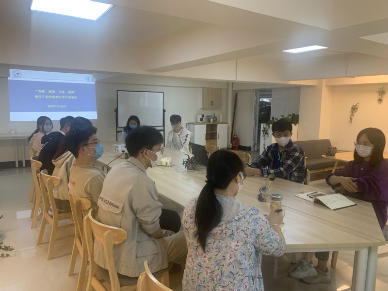 受今年新冠肺炎的疫情影响,本着“延期返校,停课不停教,停课不停学”的基本原则,学校自2月17日开展网络在线教学至今。为进一步了解学生对本学期网络教学的看法,切实提高网络教学工作质量,2020年5月6日下午,通信工程学院在第一教学楼的“教工之家”召开了“答疑、解惑、交流、提高”为主题的期中学生座谈会。会议由学院副书记何雅丽和教学副院长应娜主持,学工办和教科办相关老师以及来自不同年级具有代表性的9名学生参加了本次会议。
