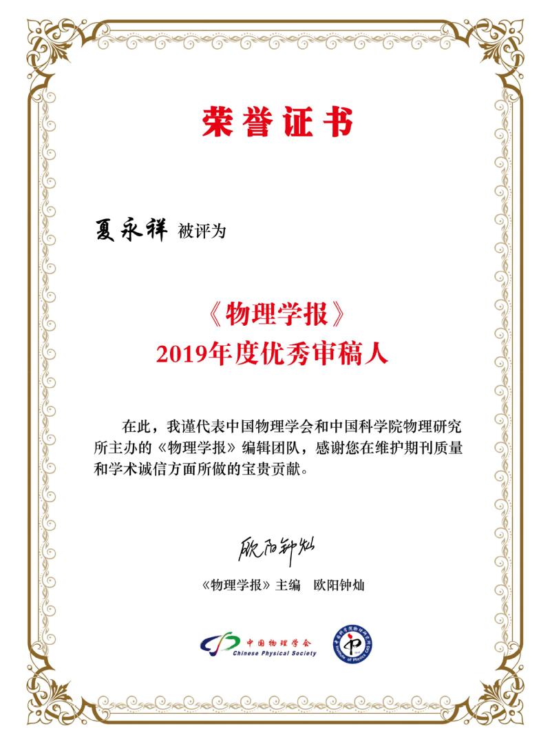 近日,我院夏永祥教授收到《物理学报》编辑部的邮件通知,当选为《物理学报》2019年度优秀审稿人,叶学义副教授当选《中国图象图形学报》2019年度优秀审稿人。