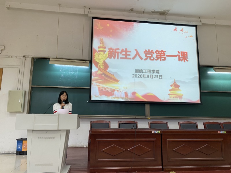为做好新生入学后政治引领和政治吸纳工作,做到早启蒙、早教育、早衔接、早培养,扣好人生的第一粒扣子,通信工程学院于9月23日下午在6教129开展了新生入党第一课。本次入党教育课由院党委副书记何雅丽主持,院党委书记罗美华、学工办主任刘宇、组织员张爱桦、优秀青年教师滕旭阳、新生辅导员徐君仪、优秀学生党员代表张书哲以及学院全体2020级新生参加。