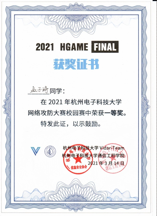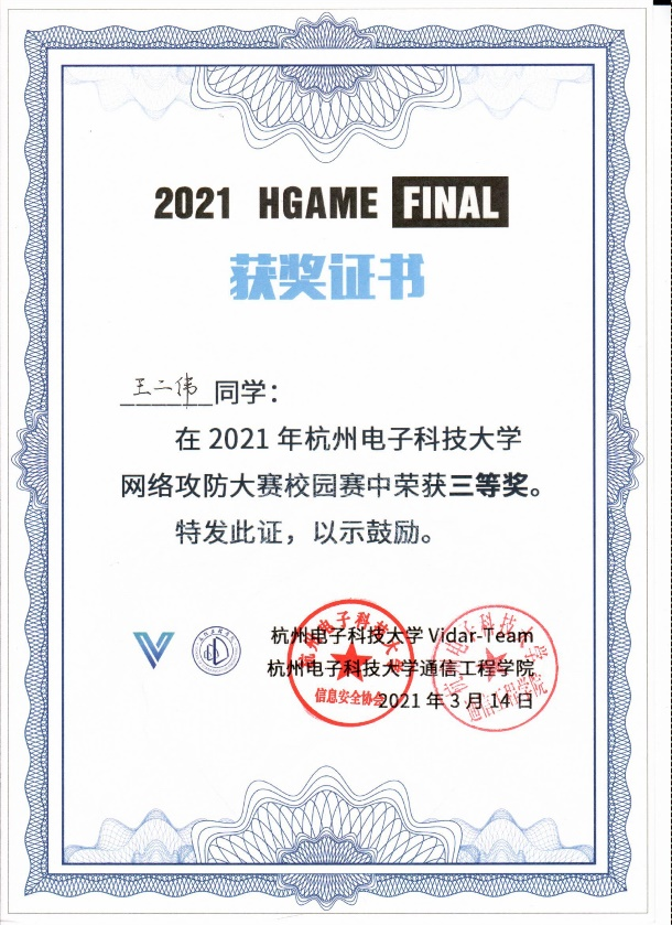 2021 年3月13日,经过1个多月的线上比赛的筛选,第七届杭州电子科技大学网络攻防大赛校园赛决赛(HGame 2021 Final)在第一教学楼 120实验室顺利举办。该赛事由杭电通信工程学院信息安全协会(Vidar-Team)主办,设一等奖六名,二等奖十名,三等奖若干名。