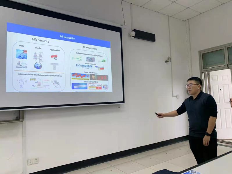 讲座围绕人工智能系统在图像识别、语音识别、自然语言理解和生物特征认证等领域的应用,并以算法对各大运营商平台进行人工智能攻防演练为例,说明了安全隐私存在的漏洞。接着,作为解决人工智能信息安全和数据隐私保护问题的方向之一,他分享了深度学习模型等相关研究。最后,韩博士与同学们就讲座内容和自己的想法进行了讨论。
