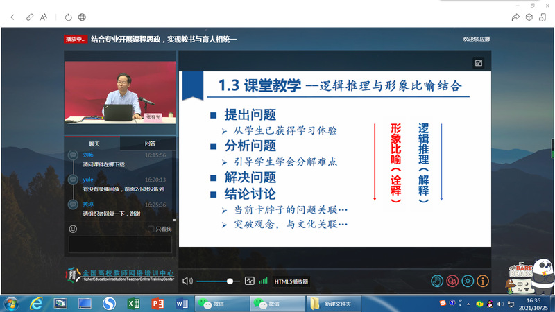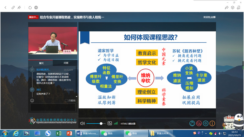 讲座中,张有光教授以《电子信息专业导论》、《创业教育》、《随机信号理论》三门课程为例,从整体设计、课内课外、师生交流、适用范围、课程建设等角度详细介绍了课堂教学、探究项目的组织和实施过程,以及如何在课程中体现思政元素。张教授的讲座既有理论深度,又贴近电子信息类专业教学实际,令参与活动的教师受益匪浅。
