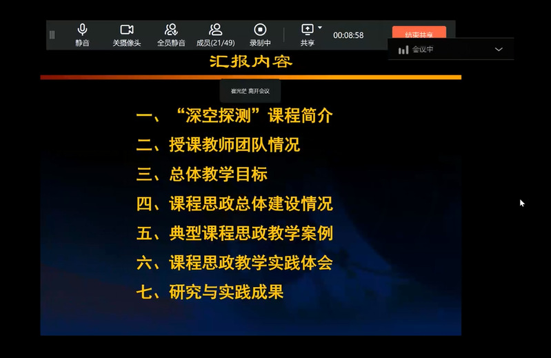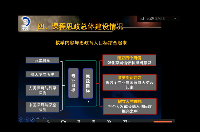 徐之海教授指出,课程思政建设应该把专业教育与立德树人结合起来,把知识传授与理想信念结合起来。他以《深空探测》课程为例,从思政育人目标、思政主要融入点设计、教学方法设计三个方面详细介绍了课程思政总体建设情况。他提出从科学与工程、世界与中国、宏观与微观、成功与失败、过去/现在/未来等多个维度进行教学设计,以课堂讲授、模型讲解、短视频观摩、课堂研讨等多种形式组织课堂教学。他分享了两个典型课程思政教学案例,从切身经历、真实故事出发,用大量详实生动的材料,讲述了中国发展航天技术的战略意义、探月工程的历史发展、现状及展望,具有很强的代入感、现实感和说服力。