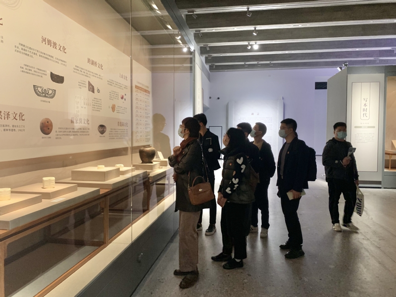 进入杭州国家版本馆,如同置身于中国古典山水画中。版本馆随山就势,疏密有致,园景互融,尤其是由龙泉青瓷拼成的一扇扇高十余米的屏扇,如同宋代的画屏,令人惊叹。大家依次参观四个主题展览,“文献之邦——江南版本文化概览展”是体现杭州国家版本馆专业特色和辐射三角区域定位的基本陈列,“盛世浙学——浙江文化研究工程成果展”全面呈现这一重大学术研究工程取得的丰硕成果以及一路走来不平凡的历程,“千古风流——浙江历史文化名人展”艺术化地展现179位浙江历史名人的生平事迹和思想内涵,“潮起之江——‘重要窗口’主题版本展”见证了“八八战略”给浙江大地带来的全方位、深层次、历史性变化。全体参观人员还充分体验文化、艺术、科技相融合的沉浸式多媒体互动,在潜移默化中受到启迪。