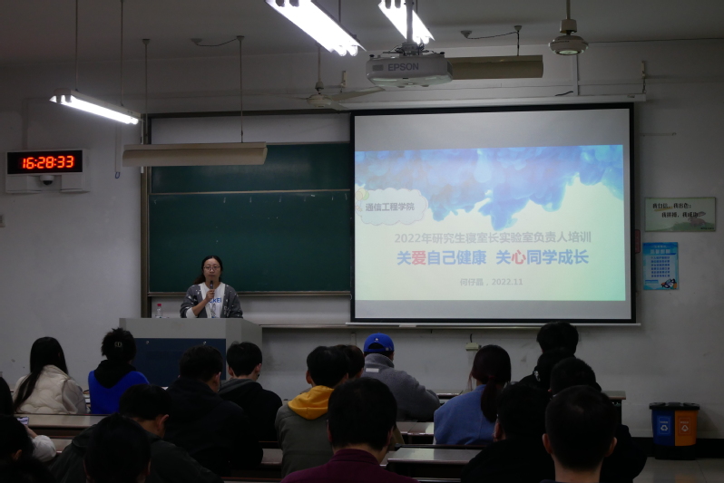 为了打造一个积极健康的校园的环境,通信工程学院11月23日下午开展2022年研究生心理健康教育培训讲座,辅导员何仔晶老师担任本次讲座主讲,向全体2022级实验室负责人和寝室长介绍心理健康相关知识。
