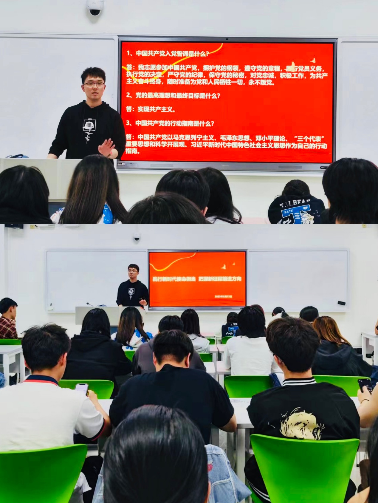 随后,吴老师就《中国共产党党章》进行专题学习,从重温中国共产党入党誓词开始,深入解读中国共产党的行动指南,准确把握党员义务。吴马超老师以“践行新时代使命担当,把握新征程前进方向”为主题,向与会支部同学们开展主题宣讲,从新时代新征程出发,把握前进方向,努力成就新时代有为青年,传递“明史修身,立德践行”理念,让同学们明晰自身使命担当,找准未来发展方向。