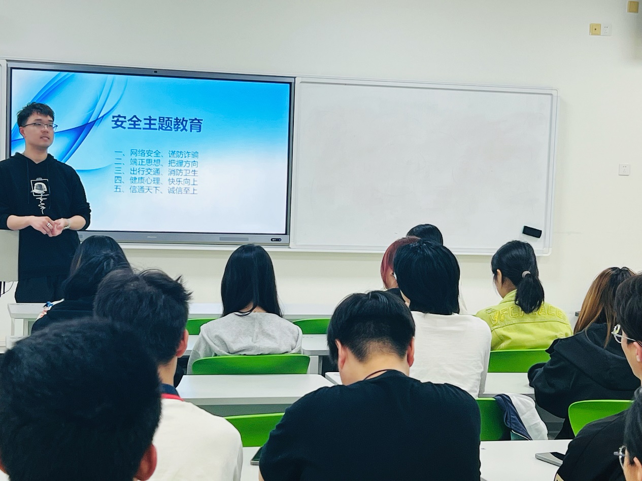 会上,吴老师首先开展安全主题教育,结合最近校内外安全案例分析以及期中考试的到来,分别从网络安全、谨防诈骗;端正思想、把握方向;出行交通、消防卫生;健康心理、快乐向上;信通天下、诚信至上五个方面向全体学生干部进行主题教育,叮嘱同学们关爱自己,关心他人,做新时代有为青年,做新征程健康青年。