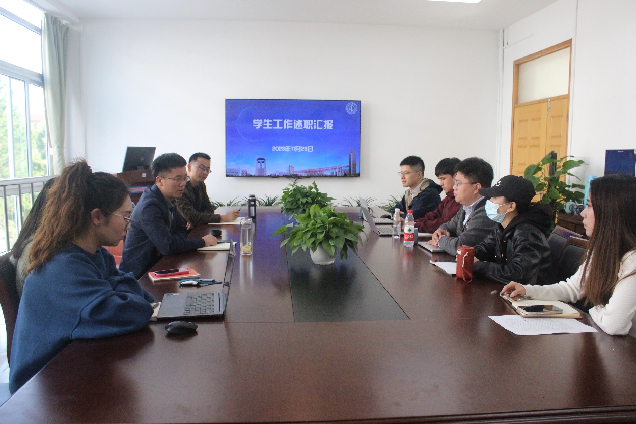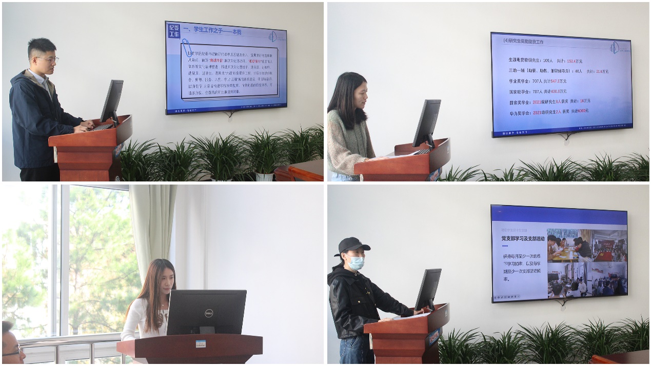 范金龙从学生管理、党支部建设、模块工作亮点和未来工作计划展开,剖析自身工作的得与失,同时对相关工作提出了创造性建议。吴马超以“廉诚德馨”“心理温馨”“安全芳馨”“学风清馨”四个方面对全年开展的学风、心理、安全等方面工作进行总结。李鑫瑶从宣传工作“常新”,学生工作“萌新”,总结反思“走心”,未来展望“求新”四个方面开展工作总结。王海宝罗列了各项学生活动和招生场次,分别对校企、资助、校友等工作进行总结。