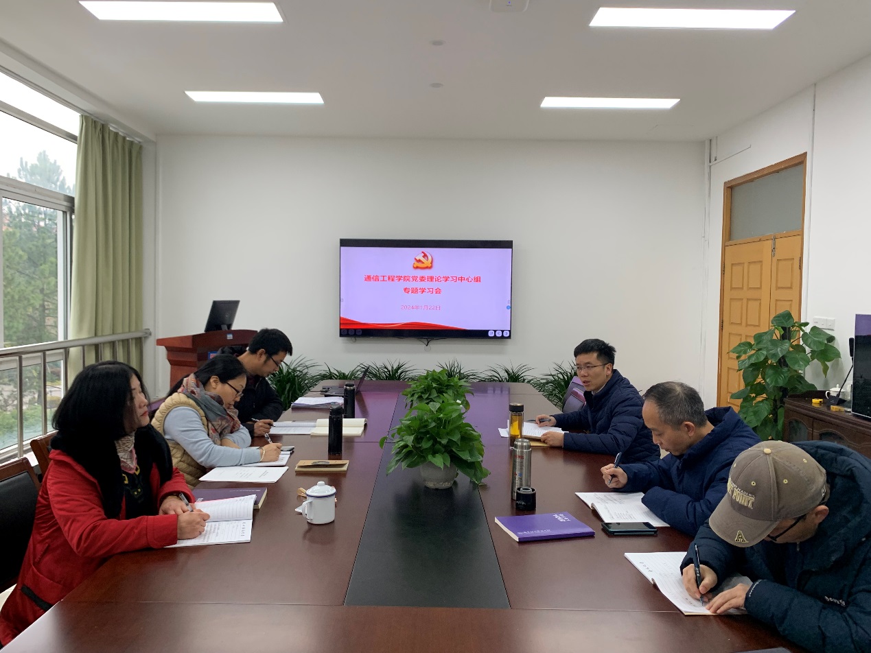 1月22日下午,通信工程学院党委理论学习中心组举行专题学习会,传达学习习近平总书记在二十届中央纪委三次全会上的重要讲话,专题学习省委书记易炼红同集中换届高校新任领导人员集体谈话精神。学院党委书记何宏主持会议并领学,理论学习中心组成员参加会议。