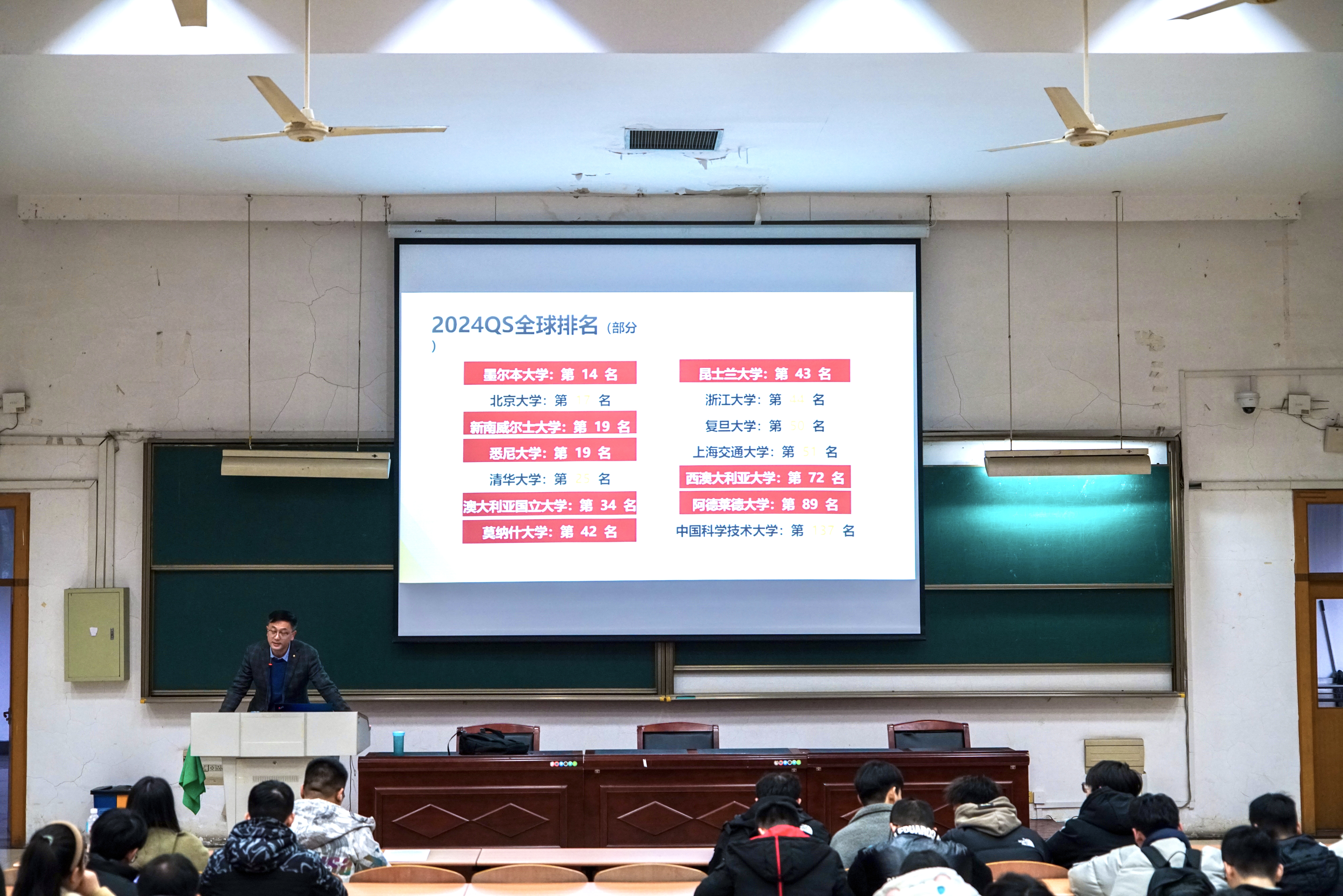 最后,根据同学们的不同情况,徐老师对未来规划提出了不同建议。有信心考研上岸的同学,应在寒假中积极准备复试内容。对于考研结果尚存疑虑的同学,可以根据自己的绩点,考虑选修二学位,积极利用学校的资源和在校生的身份。如果经济条件允许,也可以考虑出国留学。会议上邀请了国际处合作机构的老师和大家介绍了澳大利亚八所名校的留学直通车项目,包括QS排名、申请要求和就业前景等。
