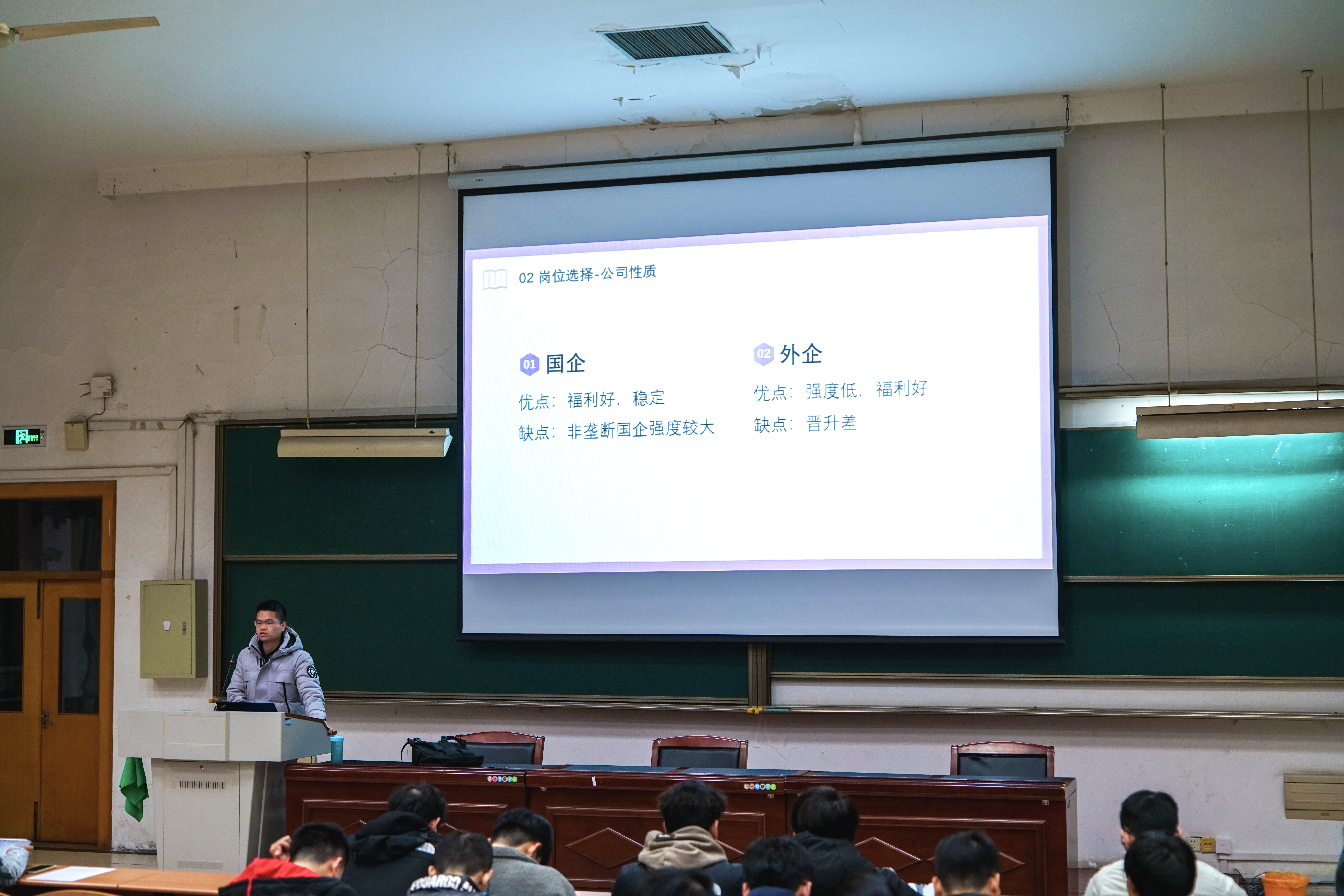 而在就业方面,以卢嘉诚同学为代表,向其他同学分享了自己的就业经验和心路历程。他从考研和就业的选择剖析了对于二者的刻板印象与现实情况的不同,再对“国企/私企”“大厂/小厂”两组选择进行了分析,最后对于同学们想找不同岗位、不同薪资的自身能力条件也提出了针对性的学习方案建议。在卢同学之后,朱钦、倪佳豪、赵朱灏、陈晨、杨天诏同学分别在面试流程、国央企笔面特点、面试后的总结反思等方面分享了自己的亲身经历和体会,为同学们提供了一手的就业信息和经验,从自身的角度出发,鼓励大家在技术上做好提前准备,在心态上做到主动出击,时刻对自己充满信心。