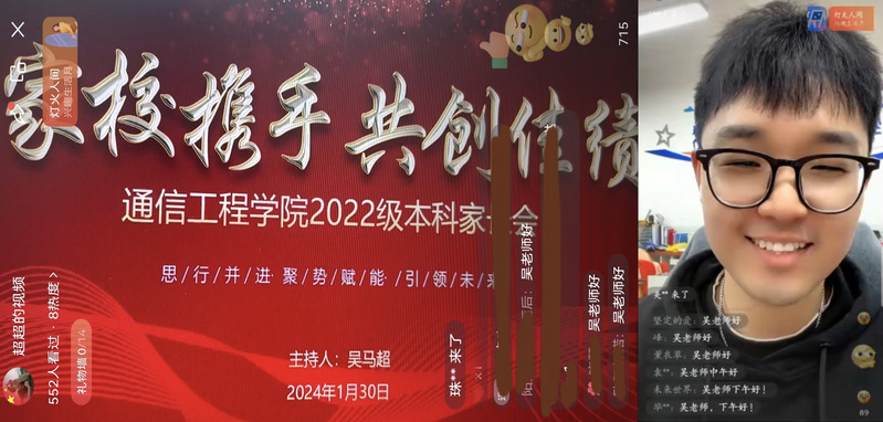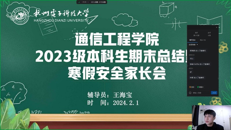 1月30日,通信工程学院2022级本科生线上家长会如期举行。会议分为三个部分,首先吴马超老师针对2023年学生管理工作进行总结回顾,随后针对年级内学生在学习、生活、综合能力发展等情况进行详细汇报,最后,吴老师针对育人过程中遇到的问题和家长进行探讨,并对家长提出建议,希望可以借此机会与各位家长达成共识,形成育人合力,促进学生成长成才。