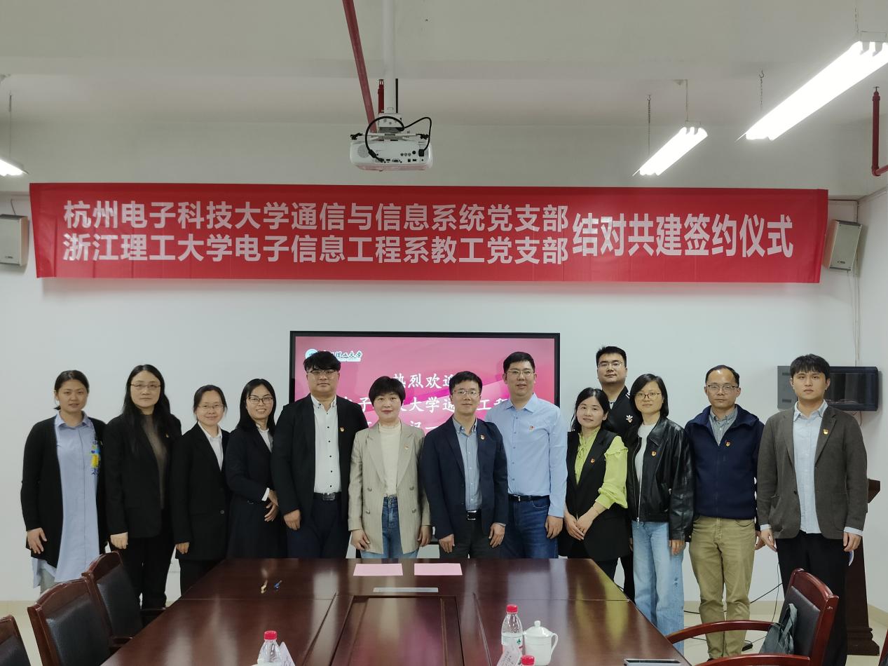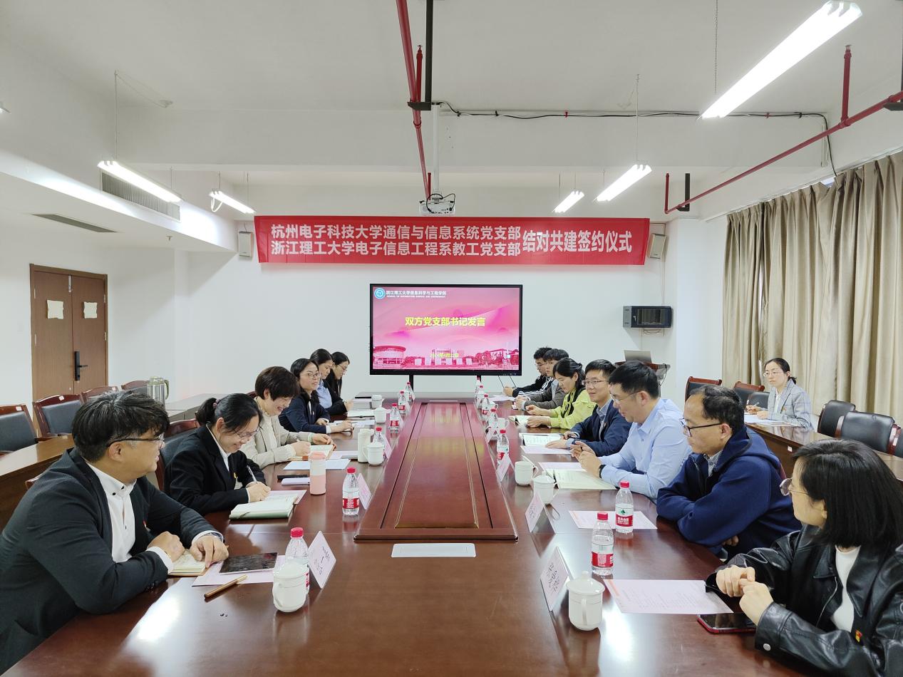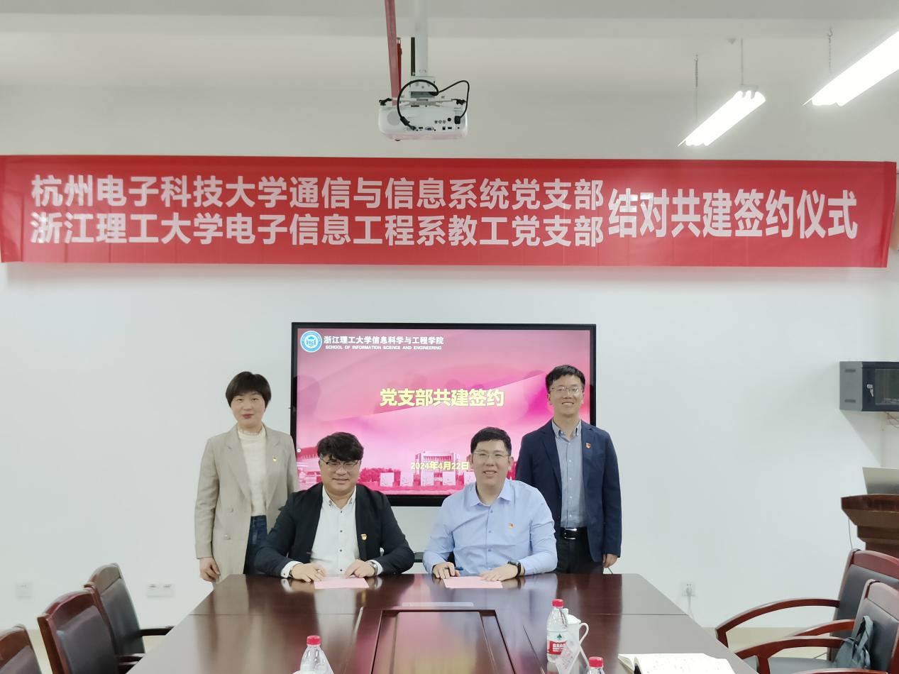 为深入学习贯彻习近平总书记关于教育、人才、科技的重要讲话精神,构建“互促互助、优势互补、共谋发展”的党建合作新格局,4月22日下午,通信工程学院党委书记何宏、通信与信息系统党支部书记潘鹏、院长助理周雪芳、教师党员刘二小和胡安中等一行人前往浙江理工大学信息科学与工程学院,与电子信息工程系教工党支部举行支部共建签约仪式。浙江理工大学信息科学与工程学院党委书记苏丽辉、党委副书记许丽芬、院长助理高金凤、电子信息工程系教工党支部书记张一嘉、电子信息工程系副主任韩永华、学工办主任朱佳琳等热情接待我院一行。