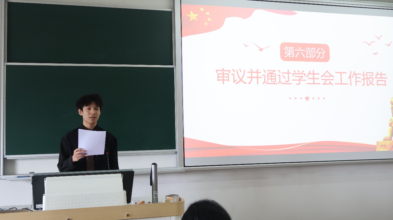 大会伊始,主持人宣布并审议通过大会代表资格审查小组名单并宣读资格审查报告,以及监票、计票人名单和学生代表大会选举办法。学生会代表陈柯名向大会作第十六届学生会2023-2024学年期间的工作报告。