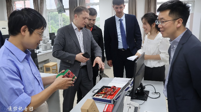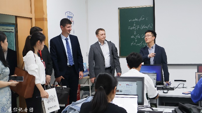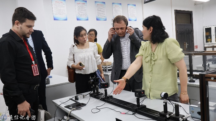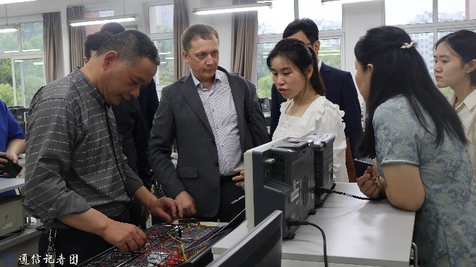俄罗斯专家团一行首先参观了我院TD-LTE移动通信、通信原理、光纤通信等实验室,实验中心副主任冯维向俄方专家详细介绍了学院的软硬件办学条件,实验中心居建林老师等现场演示了学院实验实践教学中的经典案例。在参观过程中,俄方专家与我院师生就学生培养、中俄教学合作、实验室建设等方面展开了深入交流。