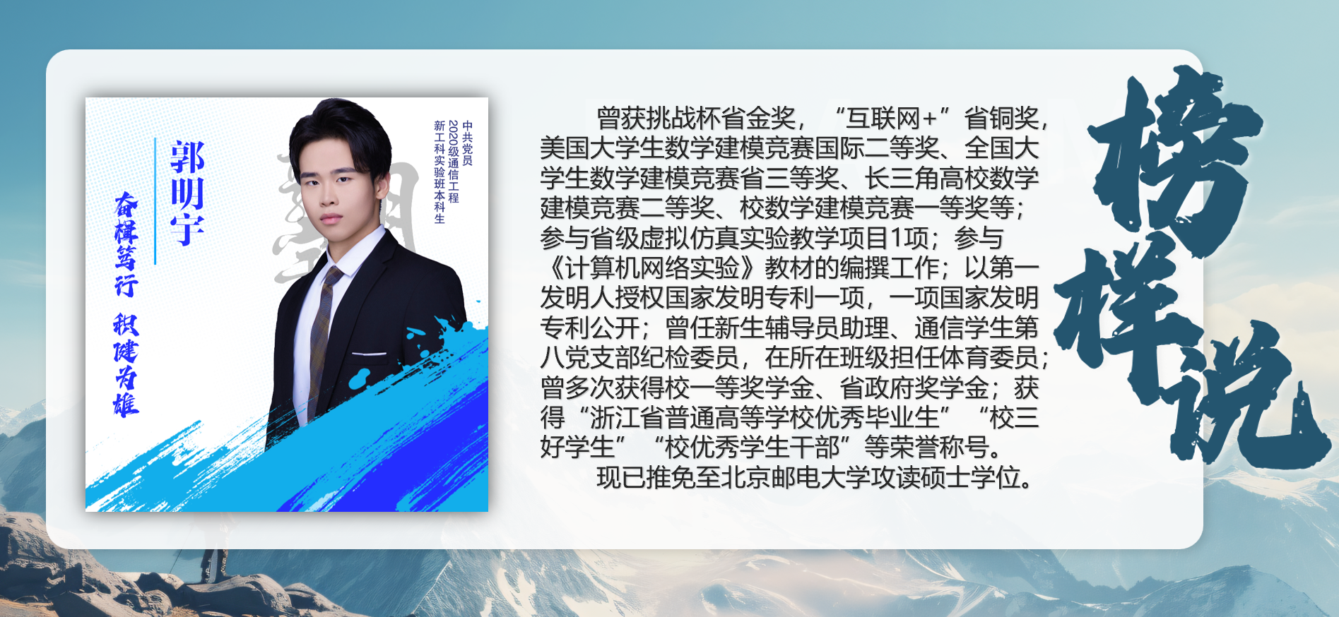 凡人微光,星火成炬。正能量的闪耀不都是以高山仰止的形式出现,更存在与平凡而伟大的生动实践中。通过“通信榜样说”的形式,将榜样力量传递给大一学子,将学院优良学风、实干作风一路传承,护航学生成长,助力学院发展。