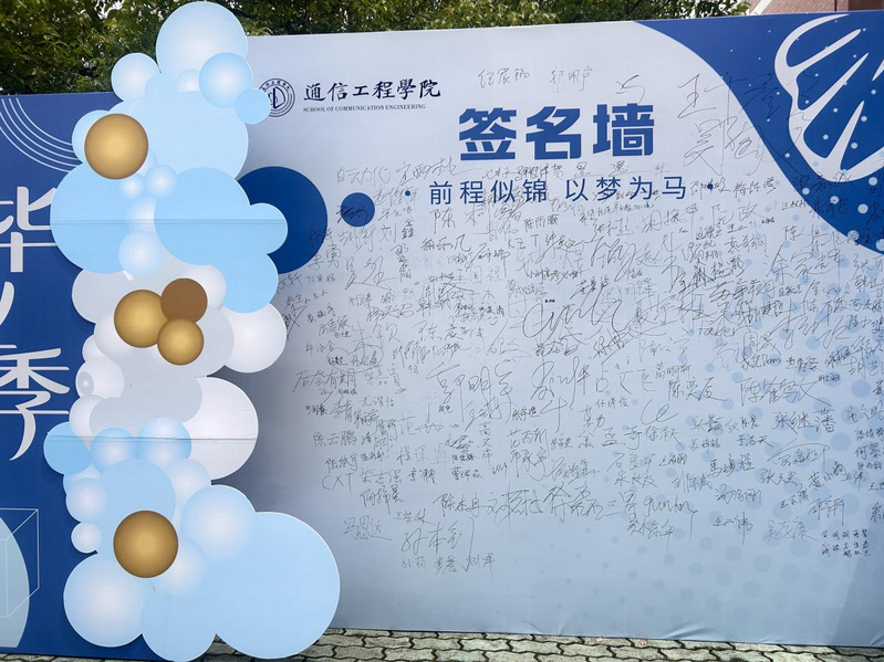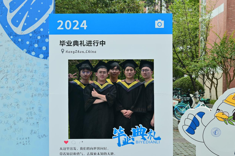 毕业照拍摄现场,毕业生们与校领导以及学院的各位领导老师一起合影,共同感谢老师们四年的付出。合照结束后,学生们在一教门前展板处进行签名打卡与合影留念,展板前,毕业生们身着学士服,摆出各种姿势,用镜头定格下这段珍贵且美好的时光。一张张照片见证了同学们毕业的美好瞬间,也构成了独属于通信学子的杭电记忆。