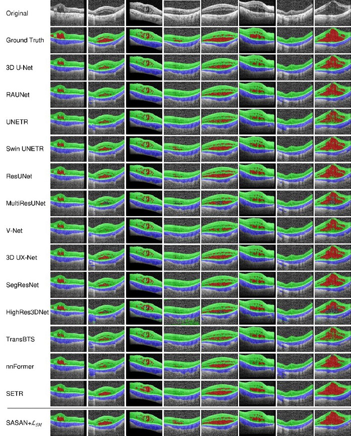 在多个公开大型数据集上进行的评估中,SASAN超过了多个SoTA模型,具有最低的误识别率,并且在边界划分上有显著改进。证明SASAN在融合低频信号后,增强了对结构信息的理解和以及对高频噪声的鲁棒抑制能力,为玻璃体浑浊病人的眼底结构分析重建产生了全新的思路。