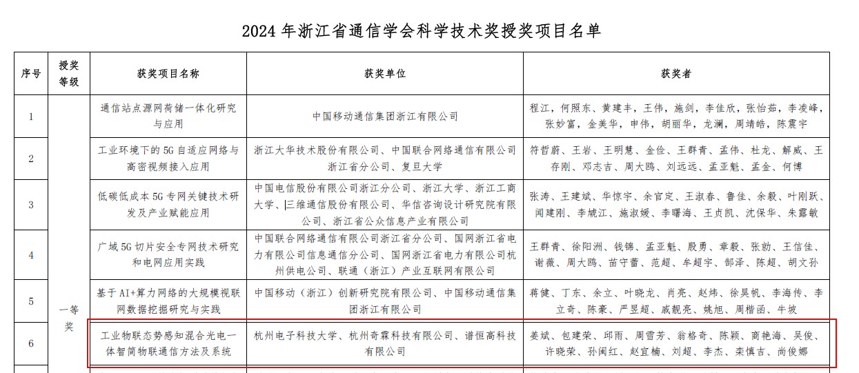 近日,浙江省通信学会发布《关于公布2024年“浙江省通信学会科学技术奖”评选结果的通告》。我院教师参与申报的1项科研成果以杭电为第一完成单位获得浙江省通信学会科学技术奖一等奖。本次共评选出30项优秀成果,其中,一等奖10项,二等奖14项,三等奖16项。