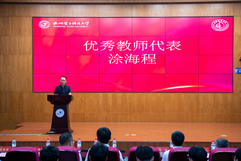 教师代表涂海程老师上台致辞,他分享了自己曾作为研究生和现任研究生导师的感悟。向同学们提出了宝贵的建议,鼓励大家要明确目标、珍惜平台、多与导师良性互动交流,这样才能有效地提高综合能力。