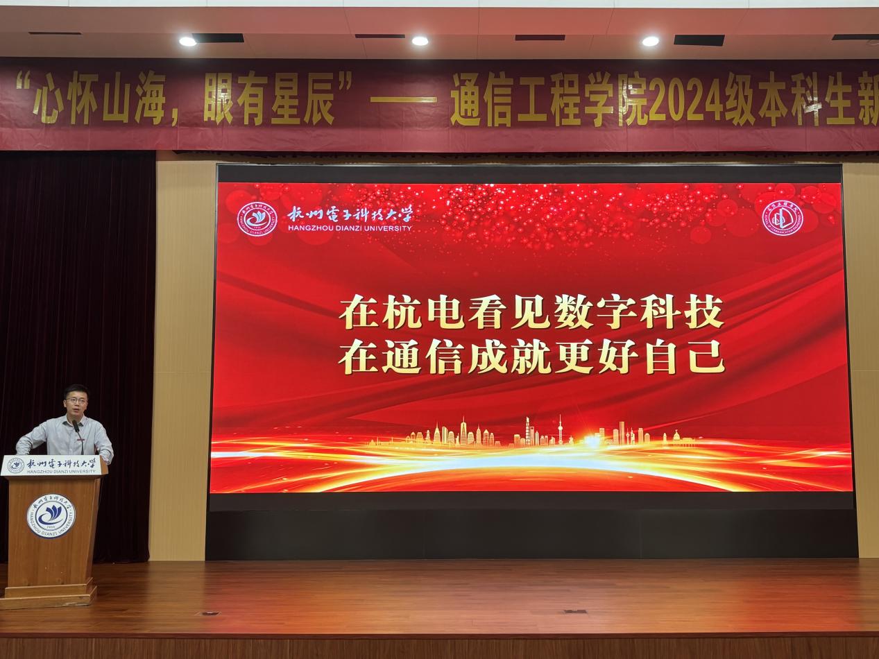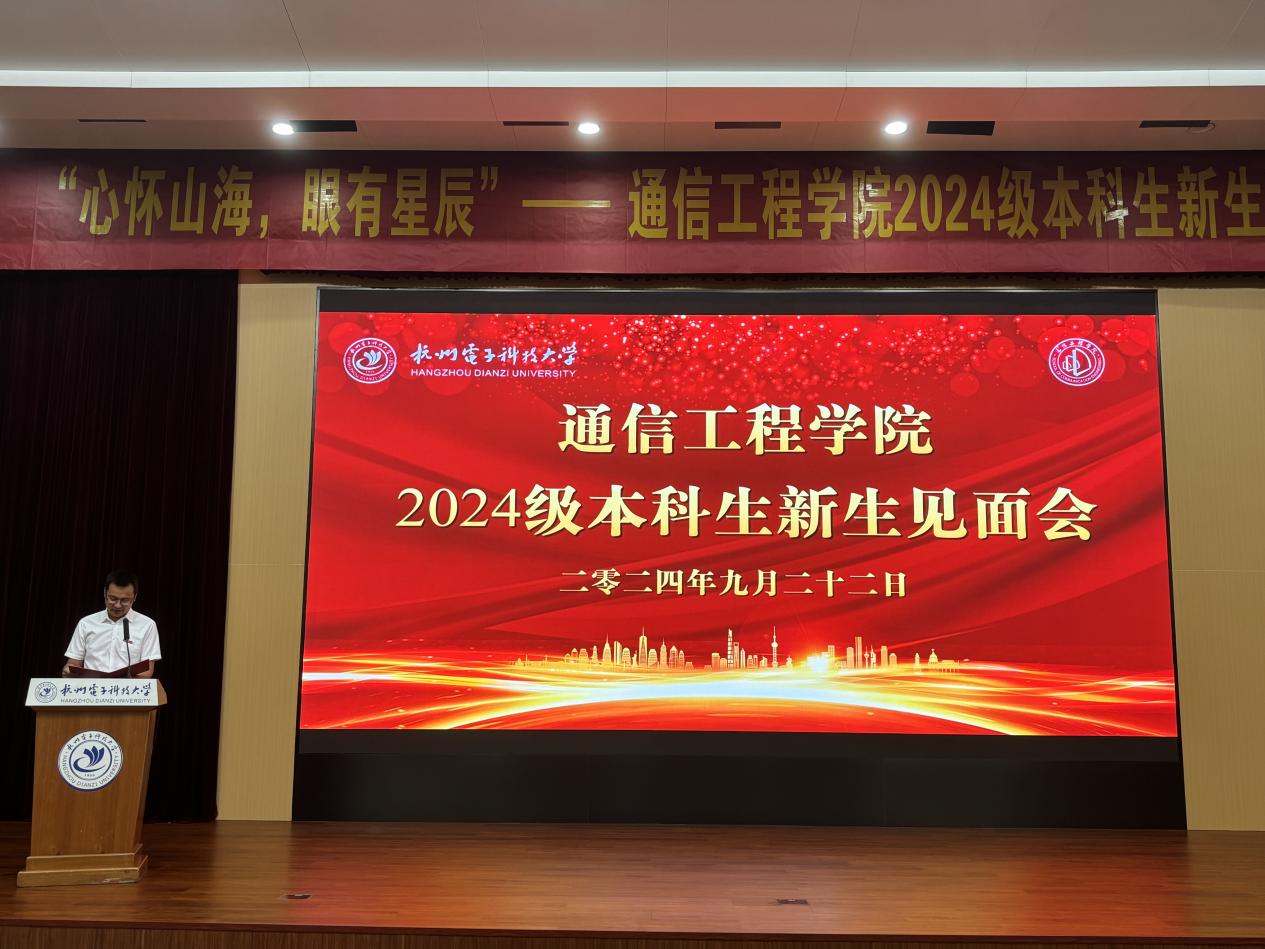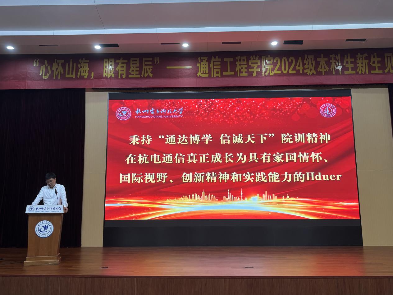 典礼上,学院党委书记何宏致辞。他对通信工程学院2024级361名本科新生的到来表示热烈的欢迎,并用三句箴言寄语同学们的大学成长之路。一是要在杭电看见美丽四季,在通信筑牢信仰之基。希望同学们在杭电感受美丽风景和人文底蕴的同时,深化荣耀通信认识,提升砥砺前行力量,在坚定为党和国家赓续学脉的道路上,激发学习研究热情,守住安全稳定底线。二是在杭电看见奋斗足迹,在通信留下青春印记。希望同学们能在杭电68年峥嵘岁月中体悟“国家大事,千万尽力”的精神内涵,感知“笃学力行,守正求新”杭电人的成长轨迹,也能在仰望星空之时不忘脚下的路,在通信学院留下青春最美丽的印记。三是在杭电看见数字科技,在通信成就更好自己。近年来,杭电正在以奋进之姿回答时代之问,为教育强国建设塑造发展的新动能、新优势。作为新通信人,应与杭电共进步,与时代同发展,在奔涌不息的时代春潮中中流击水,奋力书写新时代新青年的华丽篇章。