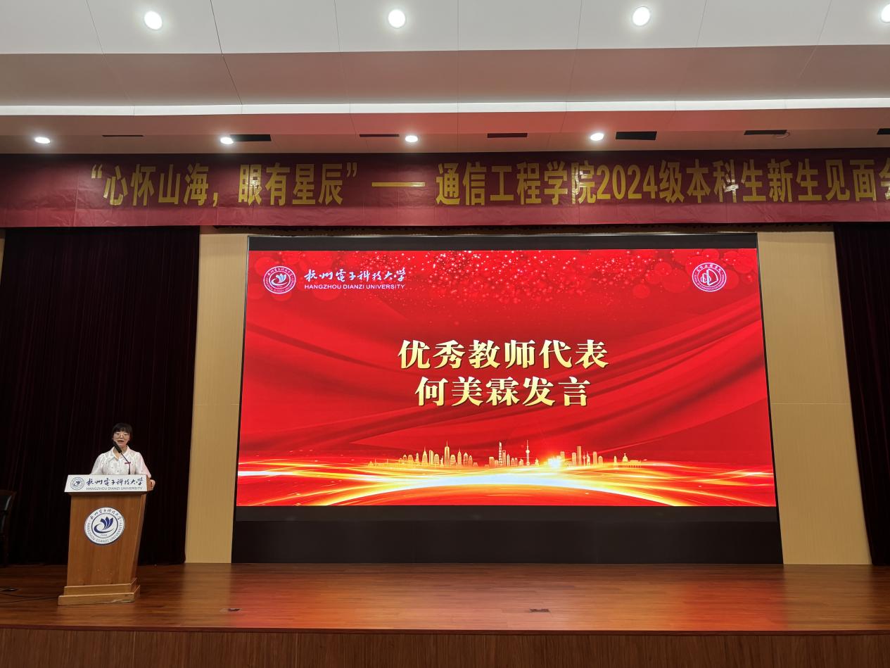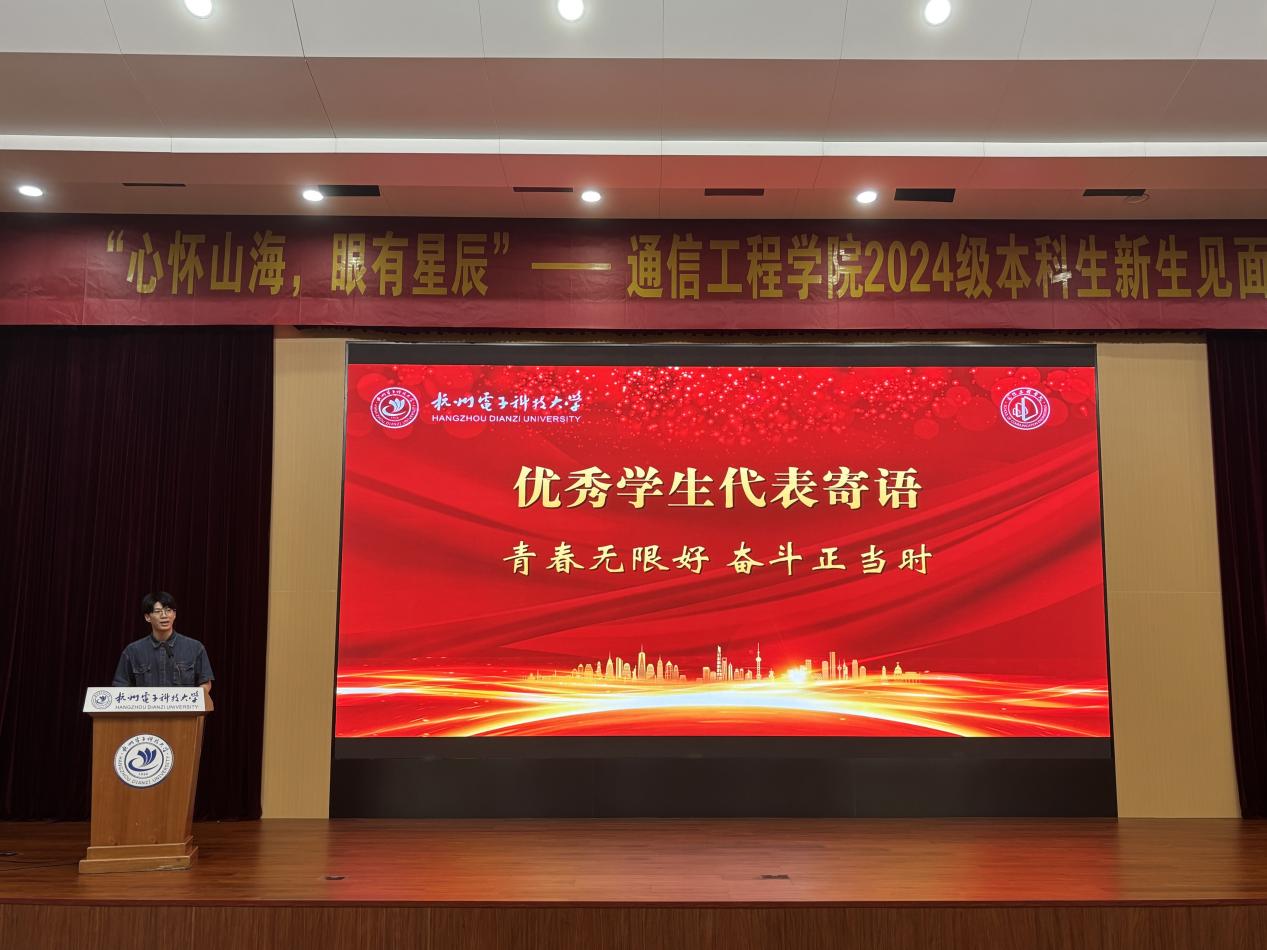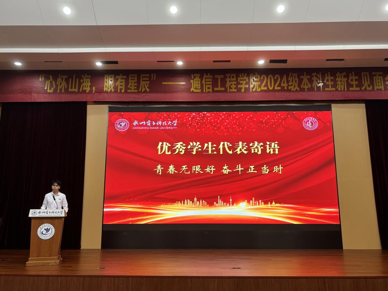 典礼上,学院党委书记何宏致辞。他对通信工程学院2024级361名本科新生的到来表示热烈的欢迎,并用三句箴言寄语同学们的大学成长之路。一是要在杭电看见美丽四季,在通信筑牢信仰之基。希望同学们在杭电感受美丽风景和人文底蕴的同时,深化荣耀通信认识,提升砥砺前行力量,在坚定为党和国家赓续学脉的道路上,激发学习研究热情,守住安全稳定底线。二是在杭电看见奋斗足迹,在通信留下青春印记。希望同学们能在杭电68年峥嵘岁月中体悟“国家大事,千万尽力”的精神内涵,感知“笃学力行,守正求新”杭电人的成长轨迹,也能在仰望星空之时不忘脚下的路,在通信学院留下青春最美丽的印记。三是在杭电看见数字科技,在通信成就更好自己。近年来,杭电正在以奋进之姿回答时代之问,为教育强国建设塑造发展的新动能、新优势。作为新通信人,应与杭电共进步,与时代同发展,在奔涌不息的时代春潮中中流击水,奋力书写新时代新青年的华丽篇章。