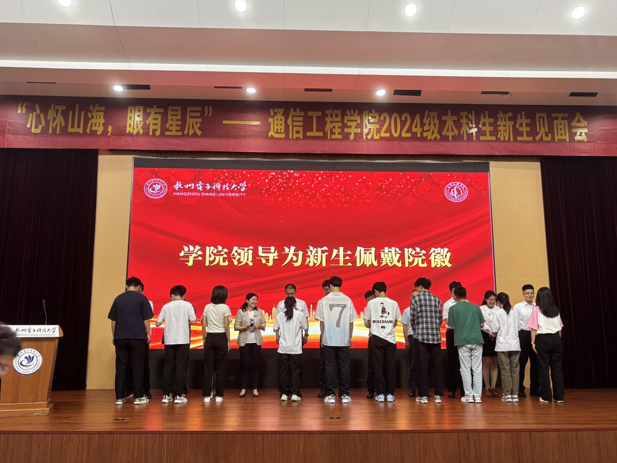 院徽是杭电“通信人”身份的象征,承载着“通达博学、信诚天下”的院训精神。学院领导嘉宾为新生佩戴院徽后,新生们就接过了前辈们手中的接力棒,肩负起传承与创新的光荣使命。