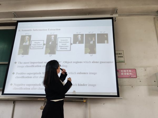 在报告会上,邓教授首先介绍了通用通信系统所涉及的三个层次问题:比特的传输(技术层面)、传输比特所承载的语义交换(语义层面),以及语义信息交换的实际效果(有效性层面)。随后,她深入剖析了第六代(6G)网络如何通过利用数据的上下文信息,提升通信任务的目标导向性与效率。报告中,邓教授结合她们团队在6G无线网络目标导向语义通信方面的研究成果,系统地介绍了针对移动机器人、数字孪生中的机械臂、图像与视频数据以及元宇宙等多种场景的语义通信解决方案,向在场师生直观展示了通信范式在语义层面与有效性层面发生的重要转变及其深远意义。
