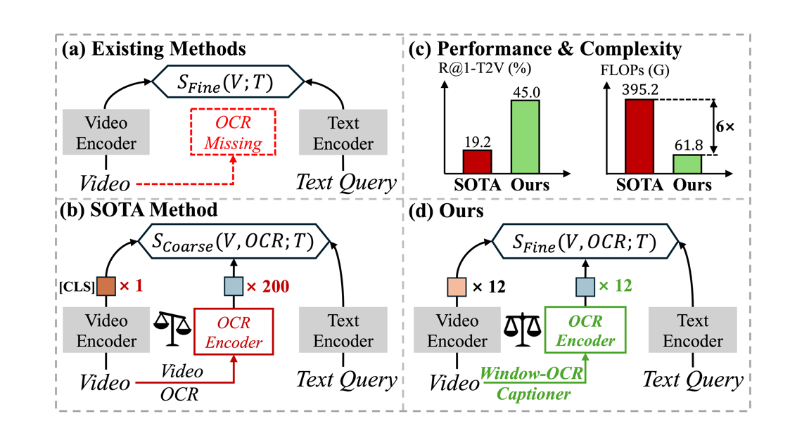 当前主流的文本-视频检索技术大多只关注视频中的单一视觉内容(如物体与场景),而忽视了广泛存在于现实世界中的异质「场景文本」(scene text)。这些文本信息往往蕴含更细粒度的语义线索,有助于跨模态检索。然而,如何高效利用场景文本一直面临两大难题:一是场景文本的时间密度过高,与稀疏的视频帧难以同步,阻碍整体视频理解;二是冗余的场景文本与无关的视频帧干扰了有效时序线索的学习,影响检索表现。