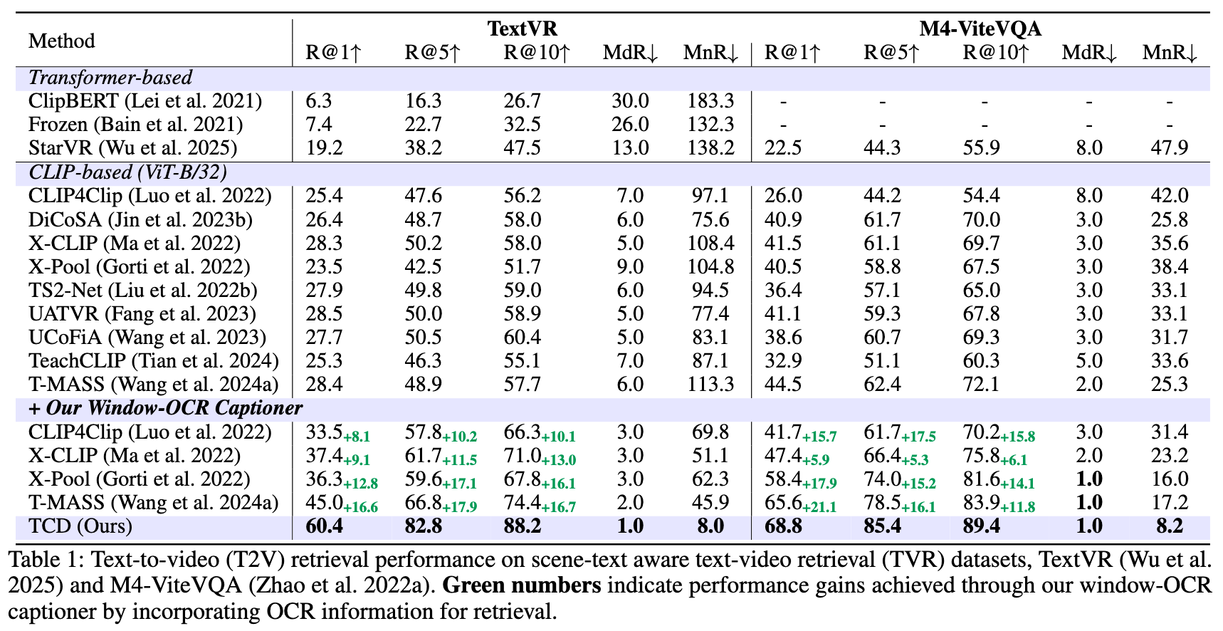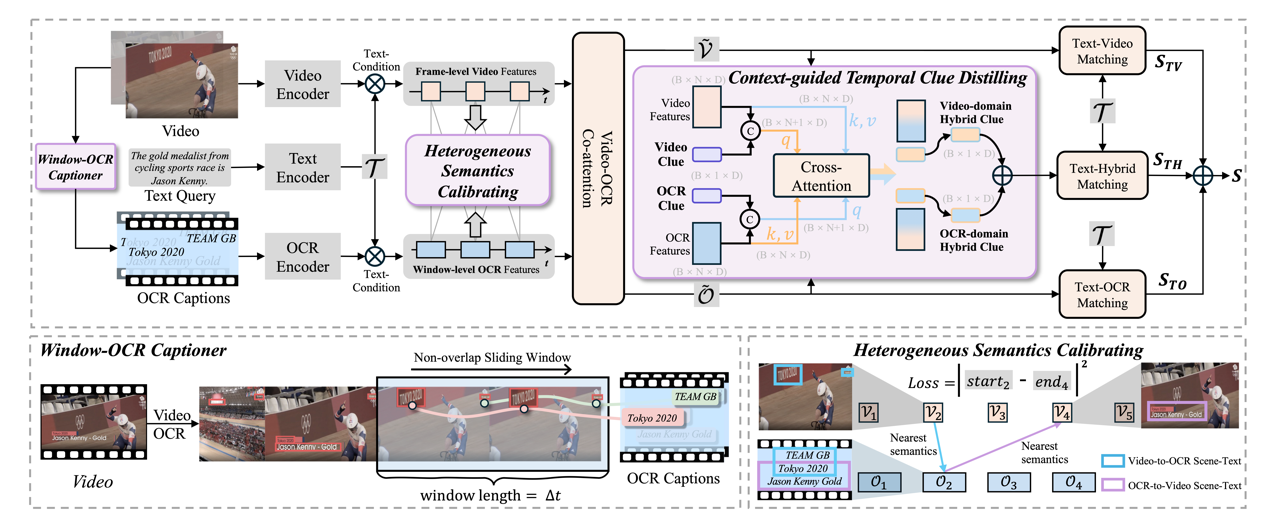 为此,论文提出了一种用于文本视频检索的时序场景文本校准与蒸馏(TCD)网络。具体而言,论文首先设计了一个Window-OCR Captioner,将密集的场景文本聚合为 OCR caption,以促进特征交互;接着,构建异质语义校准模块,利用场景文本作为自监督信号,实现窗口级OCR Caption与帧级视频特征的时序对齐;进一步地,论文引入上下文引导的时间线索蒸馏模块,以学习场景文本与视频模态之间互补且相关的细节,从而获得更具判别性的时间线索来进行检索。大量实验结果表明,TCD在三个与场景文本相关的基准上均取得了当前最优性能,并且现有方法在配备论文提出的Window-OCR Captioner模块之后获得了平均13.4%的性能提升,进一步说明了方法的有效性。
